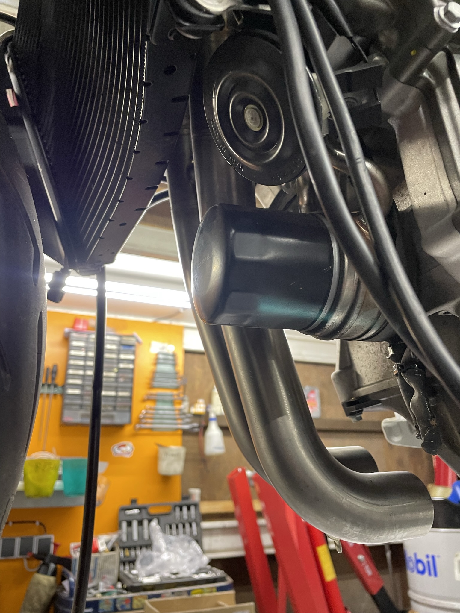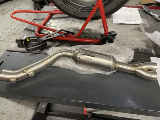 Die erste größere Umbaumaßnahme ist die Demontage der Serienanlage und der Anbau der offenen Akrapovic-Racinganlage. Man sollte besser den Kühler lösen, dann kommt man eigentlich ganz gut an die Krümmerverschraubung ran. Wie bei Akrapovic zu erwarten passt alles einfach sehr gut.