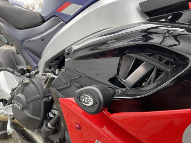 Und zu guter Letzt kommen noch Rahmensturzpads von R&G dran. Die gibt’s für die RS 660 in zwei Varianten – einmal mit ausschneiden der Verkleidung und einmal ohne. Wir haben die mit zusätzlichem Ausschnitt in der Verkleidung verbaut, weil sie stabiler sind und weil es bei der Rennverkleidung nicht schlimm ist, ein Loch reinzufräsen: