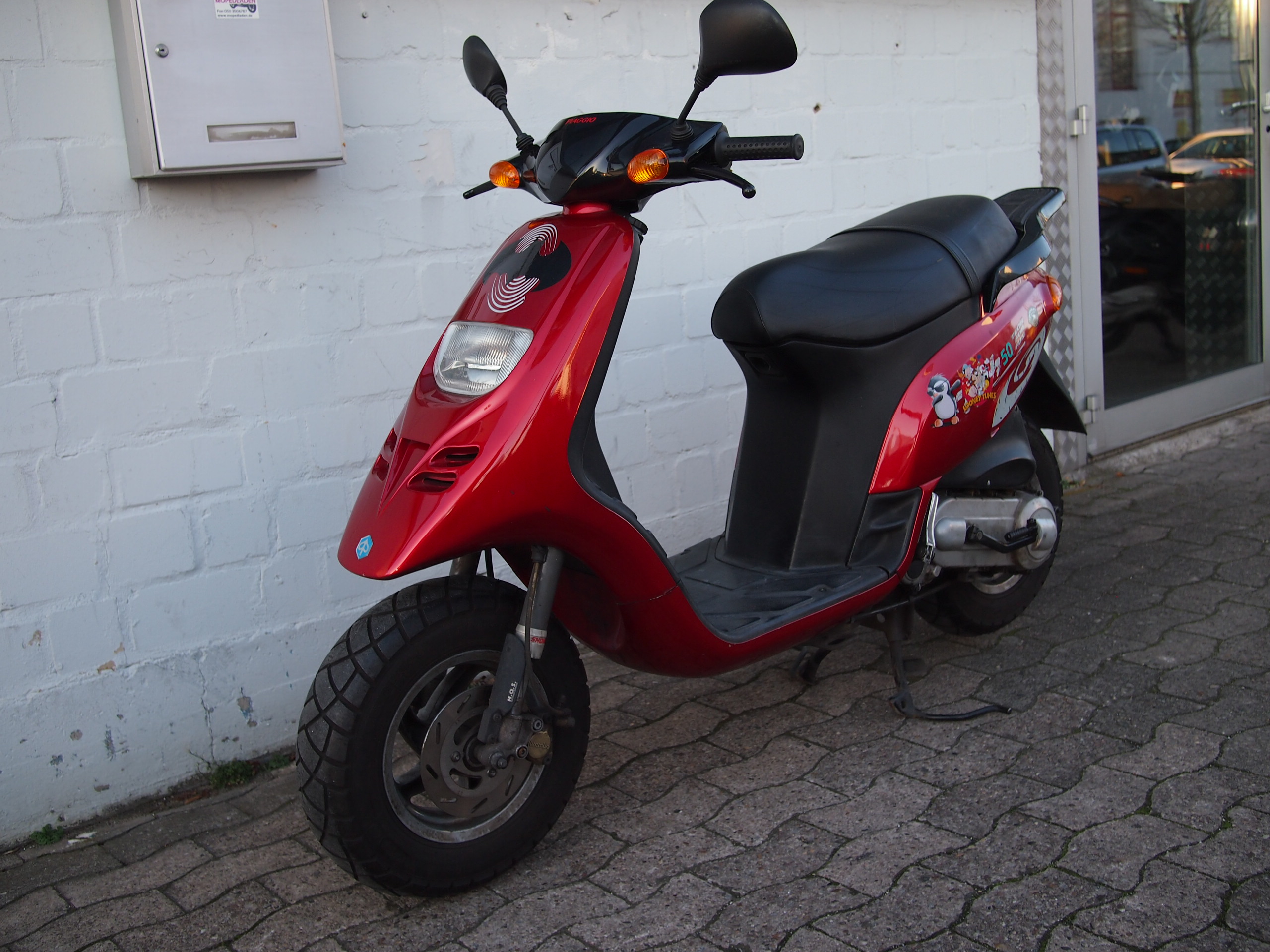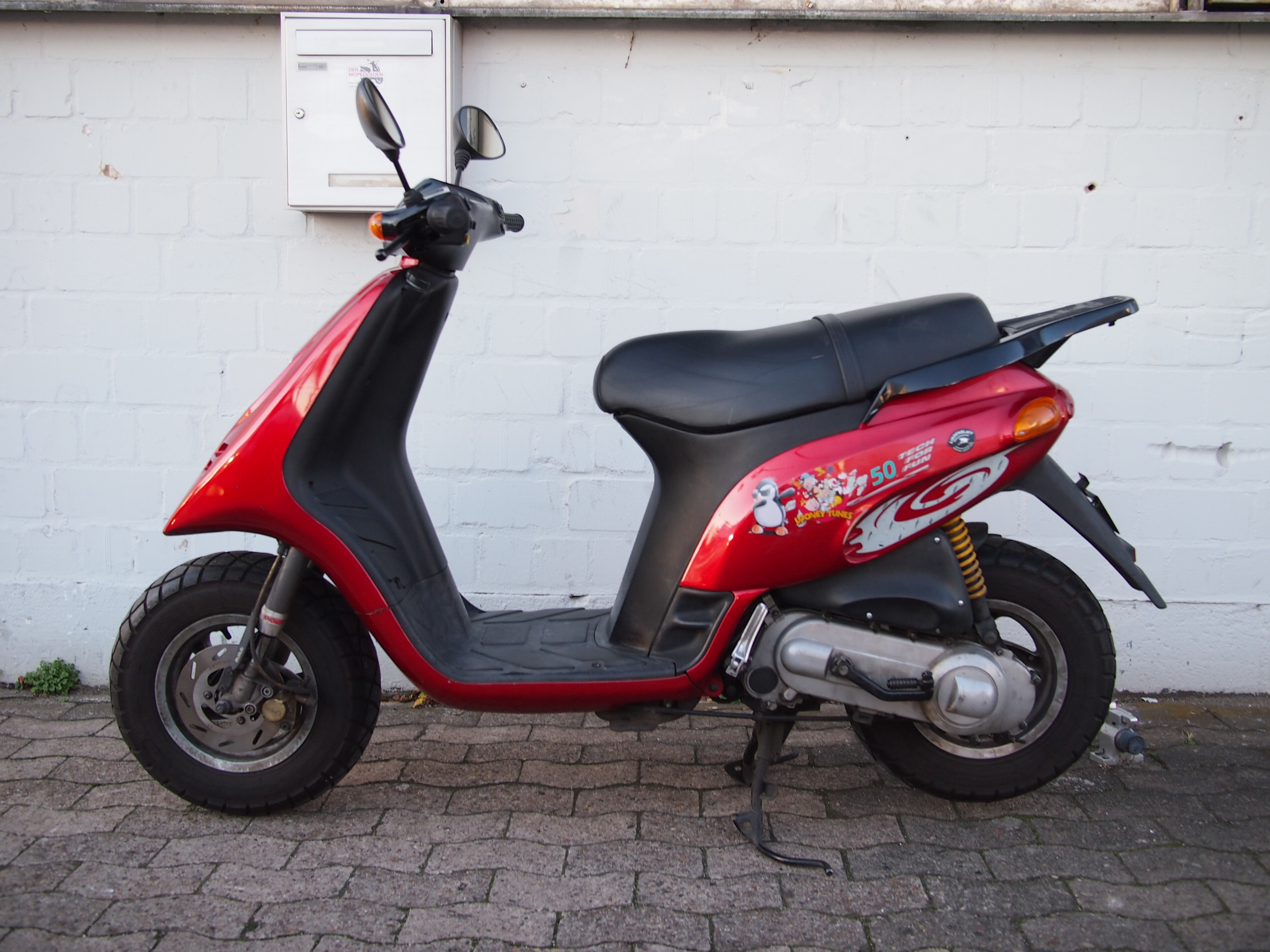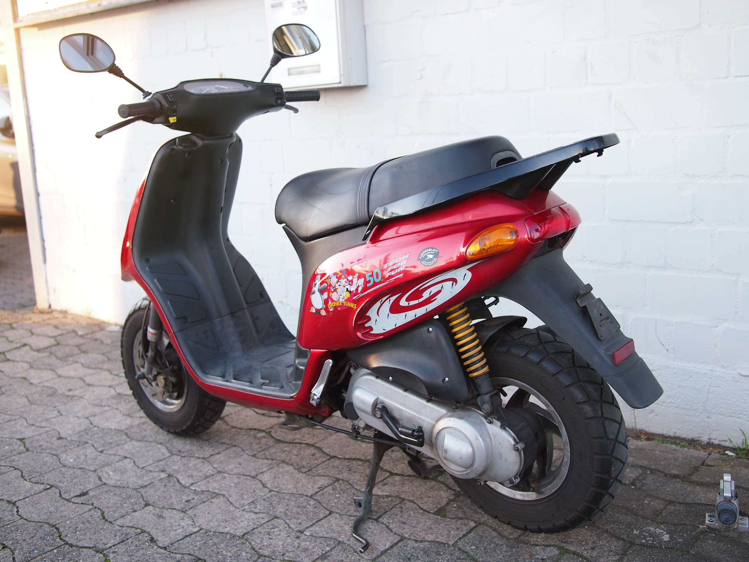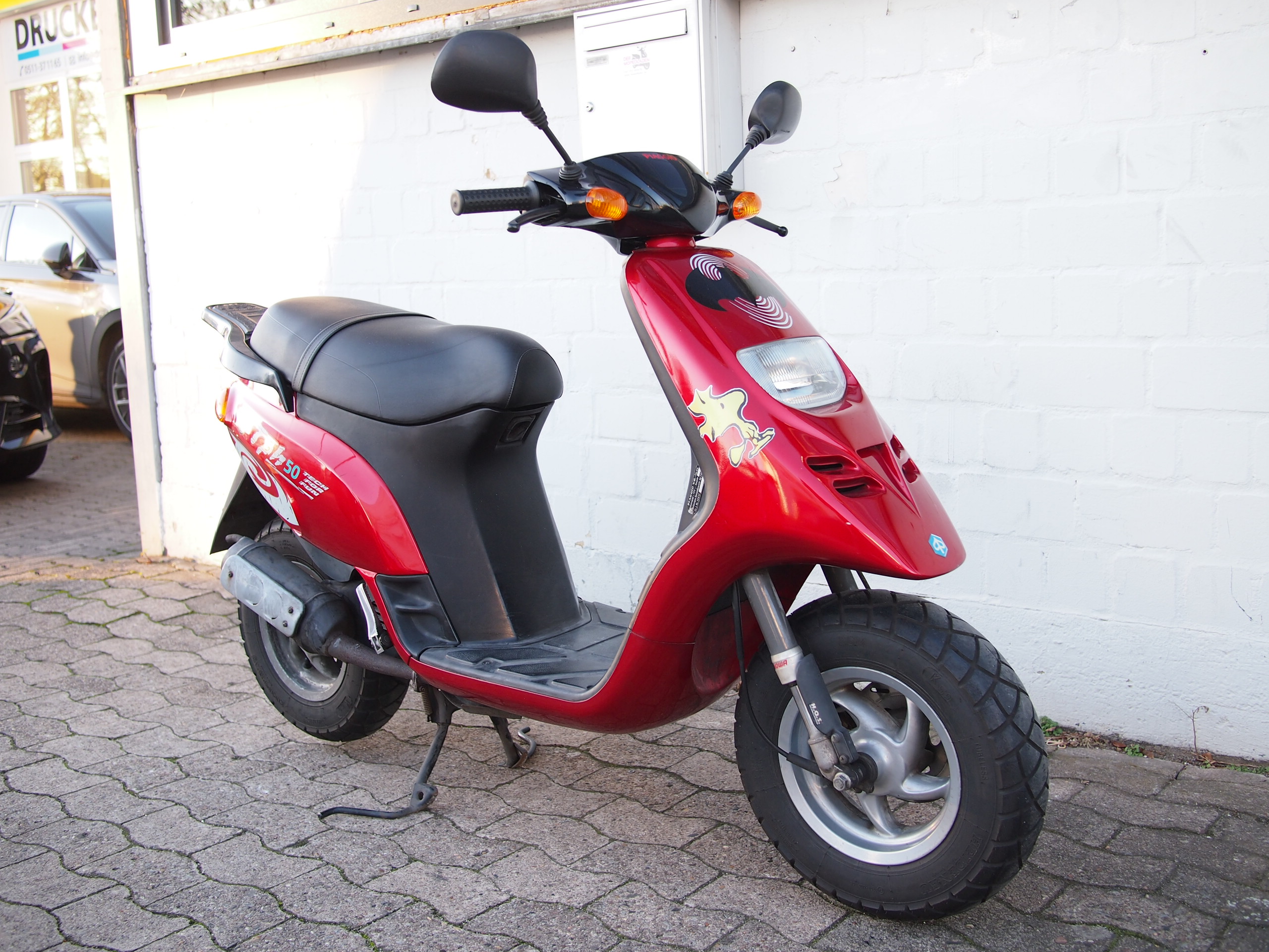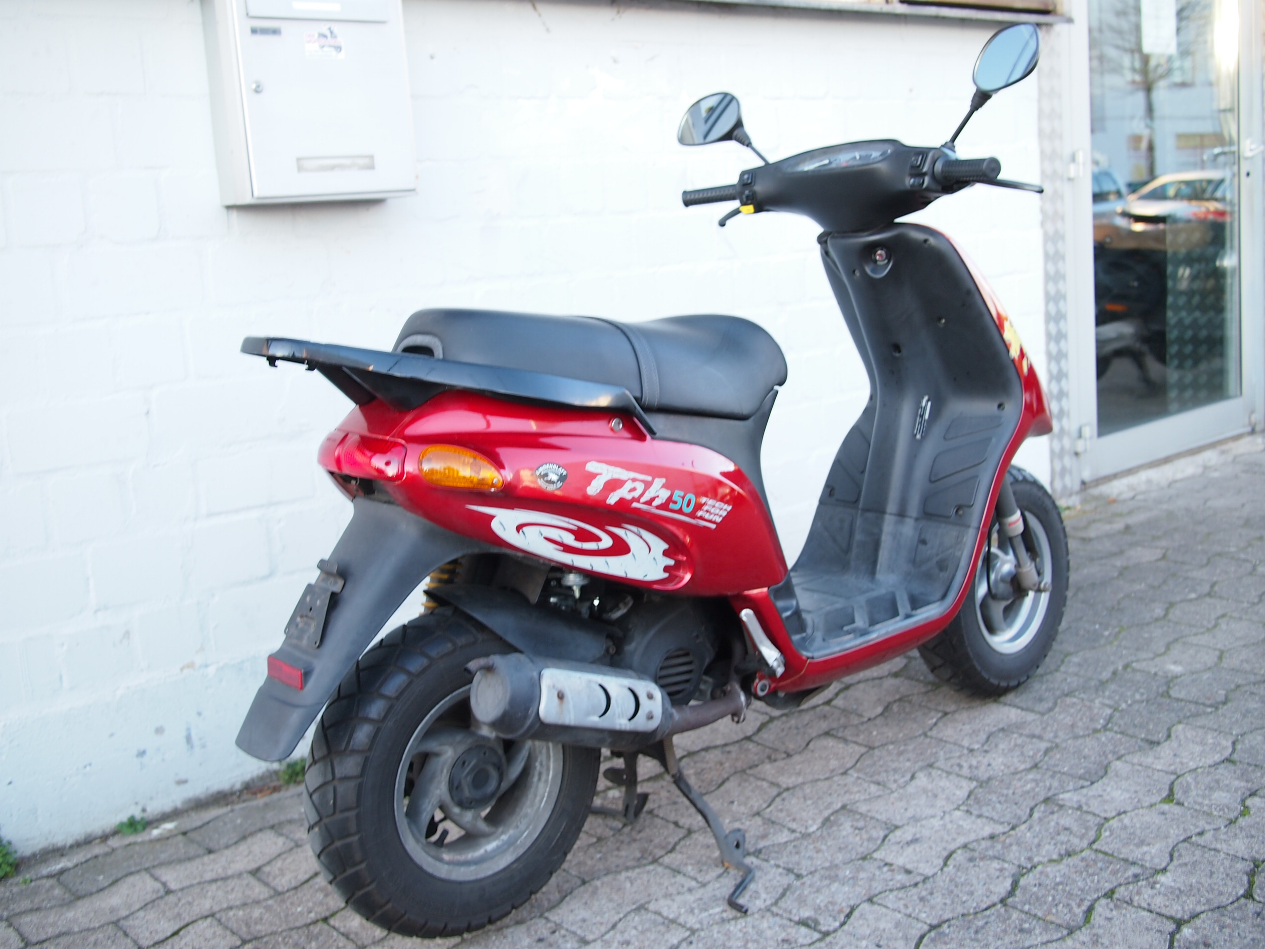 Für sein Alter und die Laufleistung steht unser Piaggio TPH noch gut da. Aufgrund seines Alters darf der TPH auch noch volle 50km/h fahren und dank seines kräftigen Zweitaktmotors schafft er das auch problemlos! Verkauf ohne Gewährleistung, da einfach zu alt. Papiere und ein Schlüssel sind vorhanden.